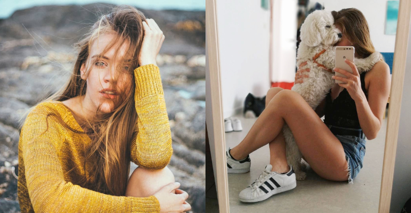 你們知道有些妹子的臉一看就知道是高個子(當然也是有例外啦!),而有一些妹子是就算不露臉也是會讓人判定一定是正妹,而眼前妹子就是這麼一號人物。女王憑著封面那張抱狗遮臉照就決定深入追查,果然獵妹多年直覺還是很受用的!